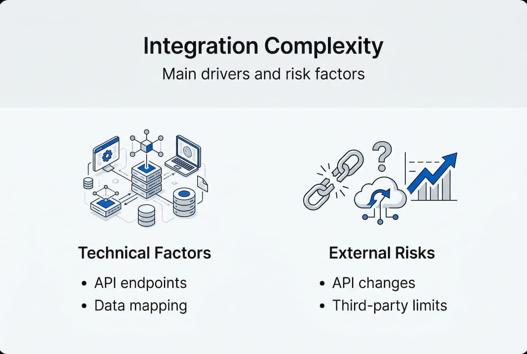 Webhooks, API changes, and undocumented features routinely cause 2x to 3x increases in effort, even for teams with prior integration experience.